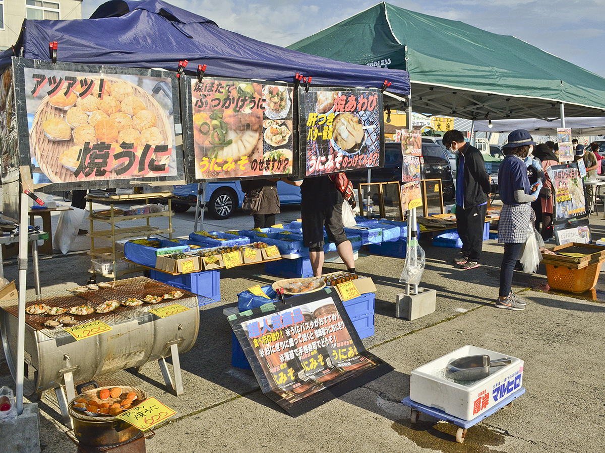朝市では鮮魚のほかウニの瓶詰めなどの加工品も人気。獲れたての新鮮なウニを使用した塩ウニは凝縮した旨味や香りが堪能できます。