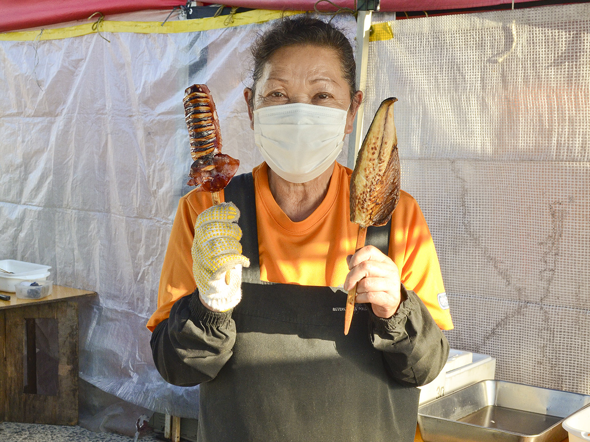 たくさんあるお店のなかでも、音と香りに食欲がばっちりそそられるのが「焼魚 石川商店」です。くるくる回転する囲炉裏で新鮮な魚介類を炭火焼きしているので、表面はパリッと、中はふっくら柔らか。どれもおいしそうですが、イカの水揚げ日本一の街・八戸に来たならイカは外せませんよね。香ばしい醤油ダレがからんだプリプリジューシーなイカは、噛むたびに旨味と甘みが広がります。大きな口をあけて思いっきりかぶりつきたい1本です。
