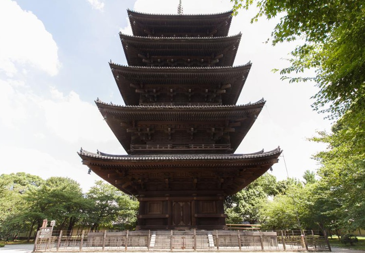 まずチェックしたいのは、こちらの五重塔(国宝)。日本一の高さを誇る木造建築で、その高さはなんと約55m。新幹線からもその姿を見ることができ、京都のシンボル的な存在でもあります。間近で見ると、その迫力に驚かされますよ。ちなみに、春・秋の特別拝観では初層が公開されます。