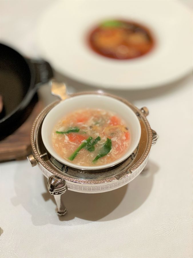 まずはオリエンタルなデザインの器に入って提供されたスープ。蓋を開けるとふわっといい香りが。アサリと湯むきしたトマト、ルッコラを具材にした、塩味の上湯スープをベースにした優しい味わい。上海料理らしく、隠し味に砂糖を使っているそう。卵白のふんわり感とアサリがぷりぷりしていて、歯ごたえも楽しめるスープでした。