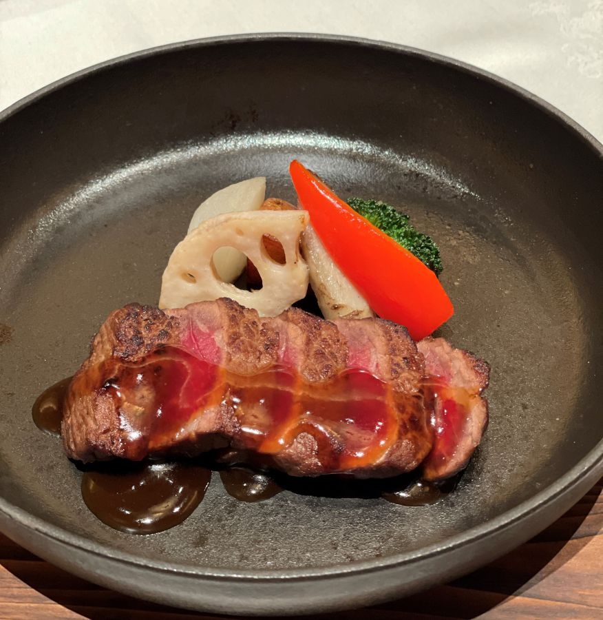メインディッシュから「紹興酒香る牛ロース肉のソテー 温野菜添え」