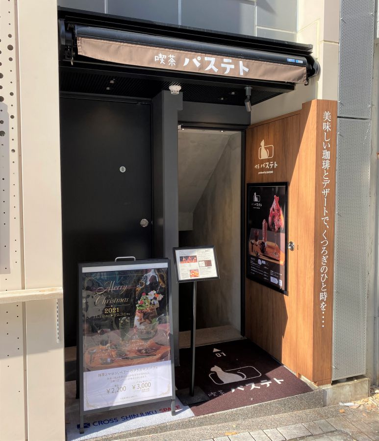 「喫茶パステト」がオープンしたのは、新宿の新名所として話題の巨大3D猫が放映されている「クロス新宿ビル」の地下1階。新宿駅東口からもすぐの好立地にあります。階段を降りていくと…