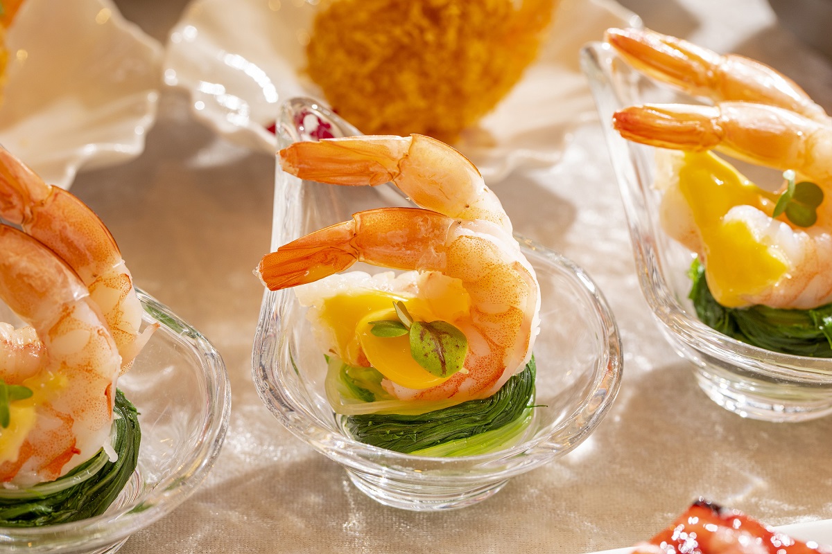 さわやかな苺ドレッシングがアクセントの「彩りサラダ 苺ドレッシング」や「海老のマンゴーマヨネーズソース掛け」などの前菜、「ふんわり卵のトマトスープ」ほか、「鮑となめこのオイスターソース炒め おこげ添え」や「蒸し鶏の山椒入り塩麹ソース」など、料理長こだわりの料理を1人1オーダー限りで楽しむことができます。