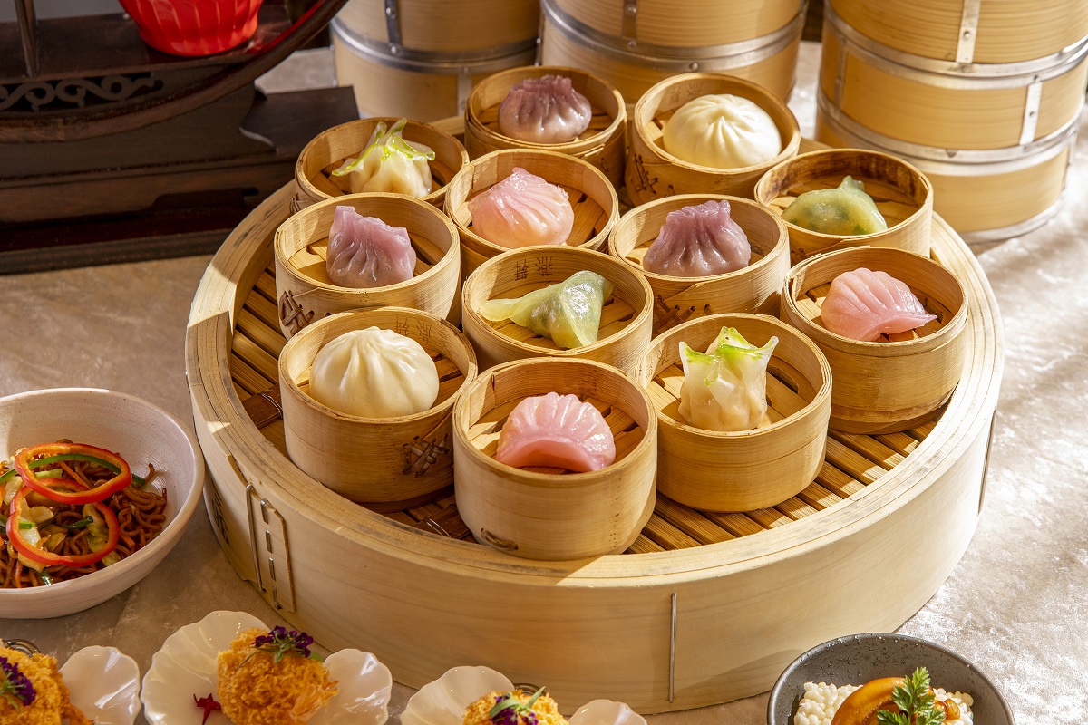 ワゴンサービスで提供される点心は、好きなものを好きなだけいただくことができます。花の形が可愛らしい「XO醤入り海鮮花焼売」や人気の「ニラ入り翡翠海老餃子」、パリッと揚がった「海老団子フライ」や「海鮮ライスペーパー春巻」に加え、もちっとした歯ごたえの「大根餅のフリッター」など10種類の点心は、熱々の状態で席まで運んでくれるのが嬉しい♪