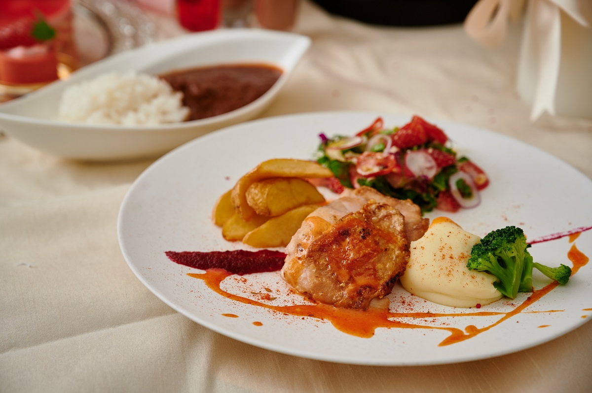 スイーツに加えて、苺を添えたサラダや、しっとりジューシーに焼き上げたグリルチキン、程よい酸味がクセになるトマトのレッドカレーなどの食事メニューも充実。ランチとしてもビュッフェを楽しむことができますよ。