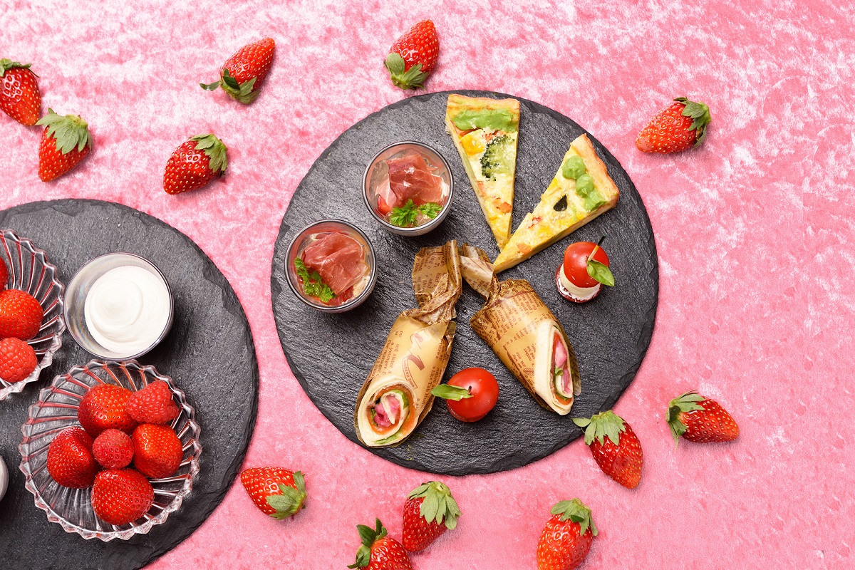 濃厚なピスタチオクリームとのハーモニーが楽しめるいちごのタルトをはじめとしたプティフールや、ストロベリーティー、オリジナルハーブティーなど16種のドリンクが楽しめるフリーフロー(3時間制)には、ストロベリーティーを用意されていて、いちごの味わいを存分に楽しむことができます。