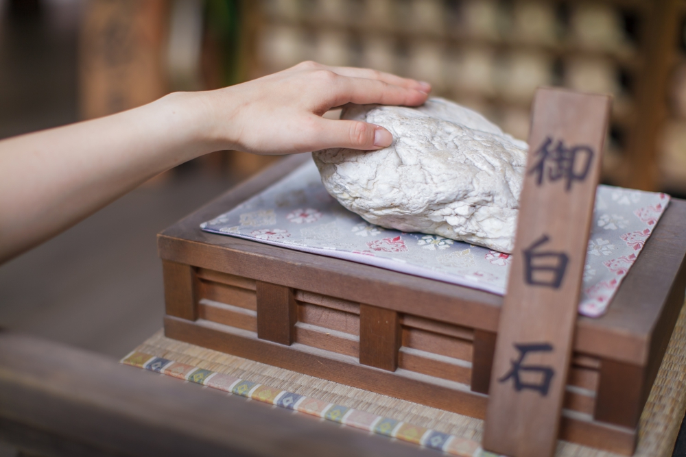鏡絵馬を記入したあとは、祭壇前にある御白石(おしらいし)を触ってみましょう。これを触った手で、そのまま顏を触ると、なんと御白石のように白く美しい肌の美人になるのだとか!