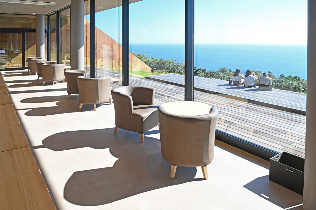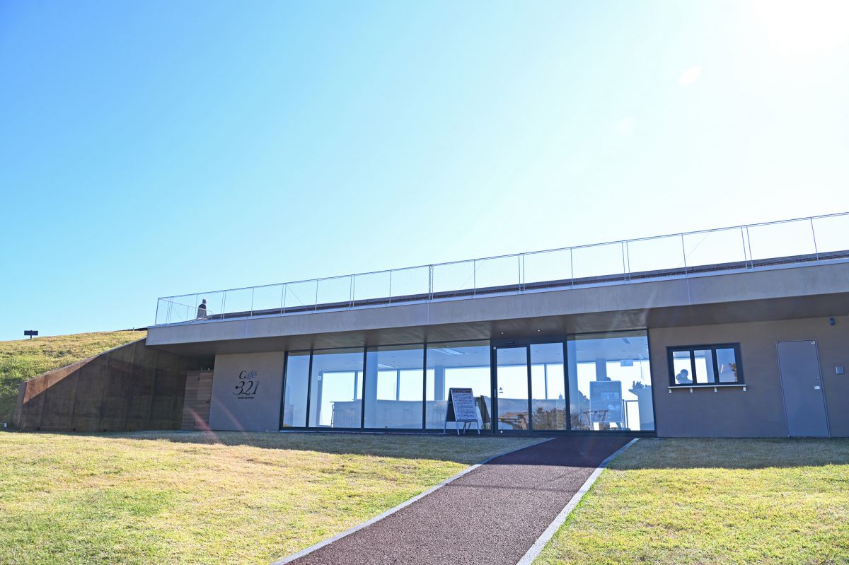 山頂でひときわ目を惹く、地中に埋もれたかのようなデザインの建物。自然の地形を生かして造られた「Café・321」は、まさに小室山と一体化したカフェです。