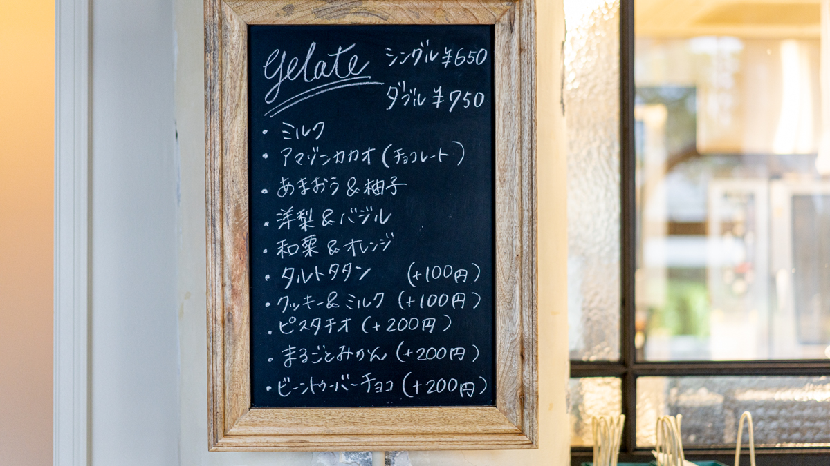 必食なのが、眞砂さん仕込みの絶品チョコレートをたっぷり使用したジェラート。アマゾンカカオ(チョコレート)とミルクが定番で、季節に合わせて旬のフルーツなどを取り入れた限定ジェラートも登場します。食材を独創的にかけ合わせるのが得意という、大山さんらしいアイディアもメニュー名の随所にキラリ。ふたりのコラボレーションをダブルで堪能することにしました!