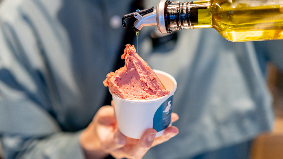 アイスクリームカウンターでの盛り付けにもご注目。オーダーした「あまおう&柚子」にシロップをかけているのかと思ったら、なんとこちらはオリーブオイルでした。いったいどのような味が楽しめるのでしょう? わくわくが止まりません!