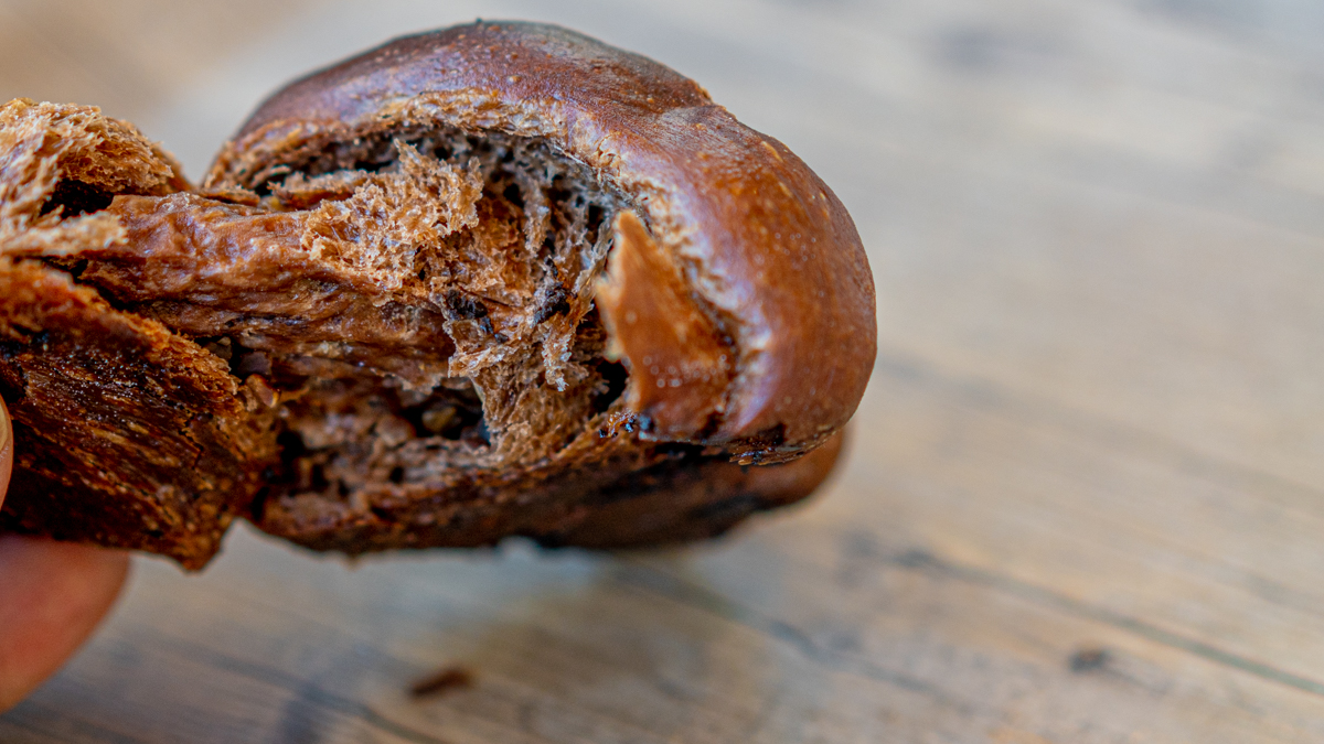一方チョコレート好きにオススメなのが「Wショコラ バターロール」240円。自慢の生地にカカオパウダーとチョコチップを練り込み、棒状のチョコレートを中心に入れてからパンを成型して焼き上げています。