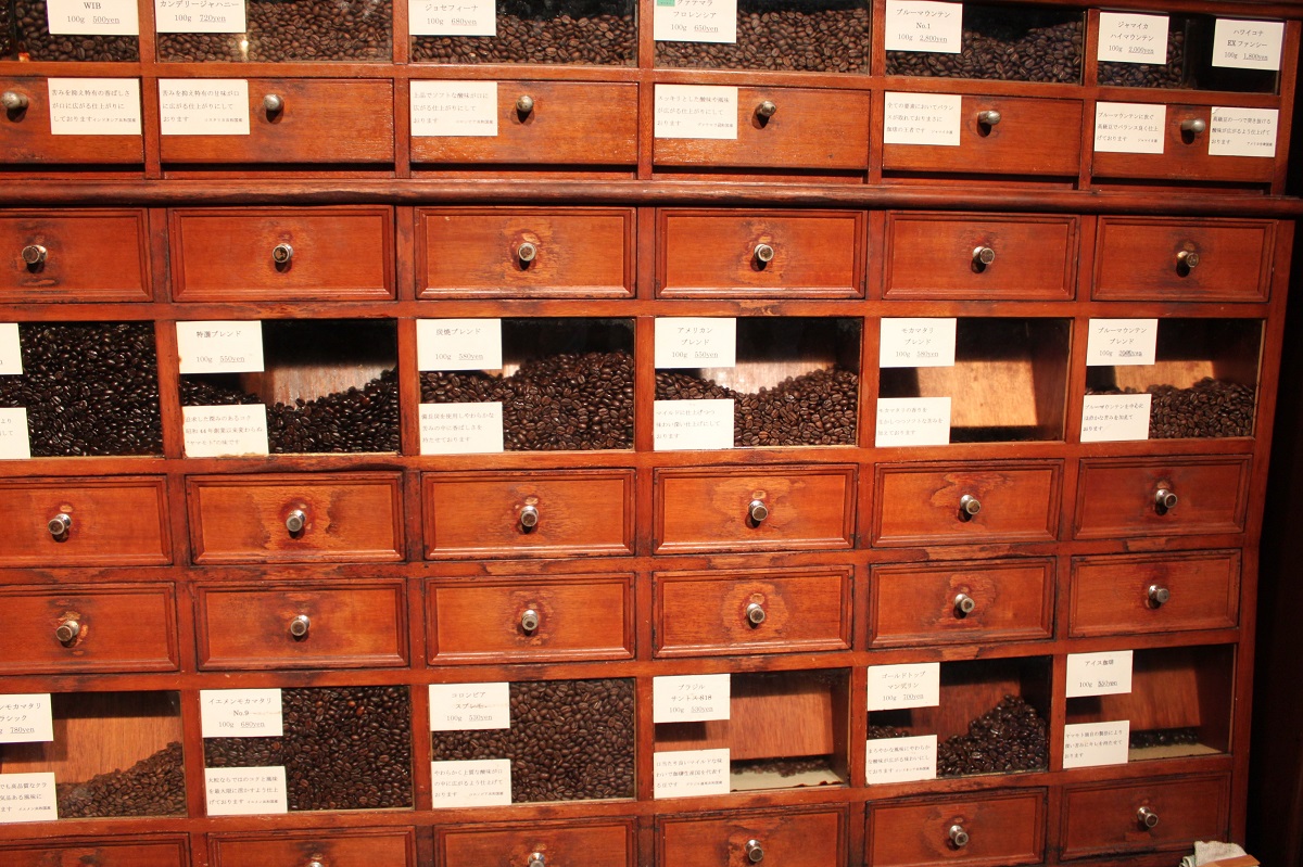 入り口横の大きな棚には、毎日焙煎されるコーヒー豆が常時20種類!オーダーが入るとこちらからキッチンへと、香り高い豆が運ばれます。