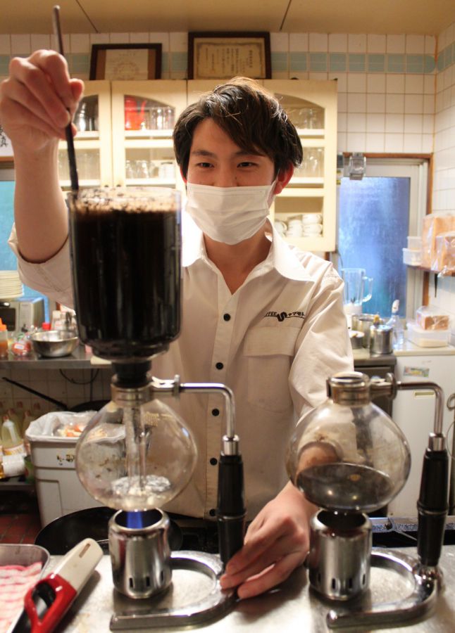 真剣なまなざしでコーヒーを抽出するのは、2021年春から「コーヒーショップ ヤマモト」のスタッフとして新たに仲間入りした息子さん。キッチンと客席とを忙しく行き来しながら、いきいきと楽しそうな様子が伝わってきます。