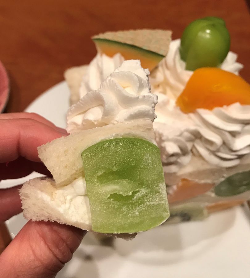 フルーツと生クリームを挟み、ほどよくなじませておいたサンドイッチを、オーダーが入るごとに丁寧に切り分けていきます。「うまくフルーツがセンターに並んだらうれしいですよ」と笑顔の山本さん。12月から5月頃までは、シャインマスカットがイチゴへと変わります。