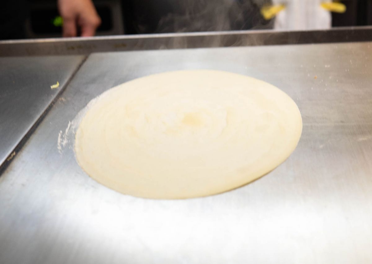 越田のお好み焼は、生地からこだわりがたっぷり。生地は、鶏のガラを叩き1日寝かせ、それを粉と混ぜ合わせて濃く練るという作り方。この作り方によって、他店と比べて簡単に破れない生地になります。