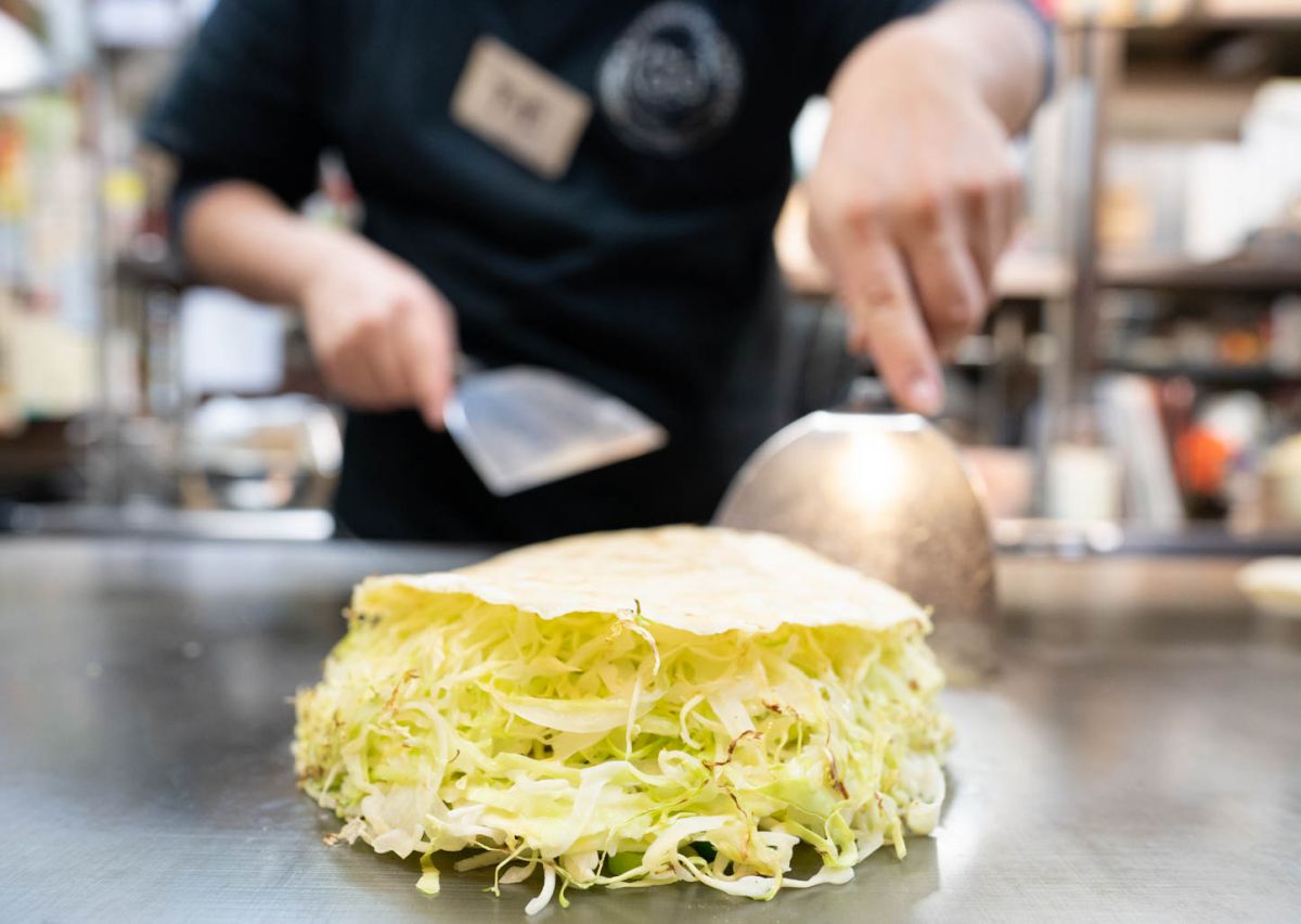 細めに切られたキャベツをふんわりと乗せ、形を整えた後は、麺を乗せるまで触らず、自然にじっくり蒸していきます。越田のお好み焼は、ひっくり返した後もヘラで押さえないのがポイント。