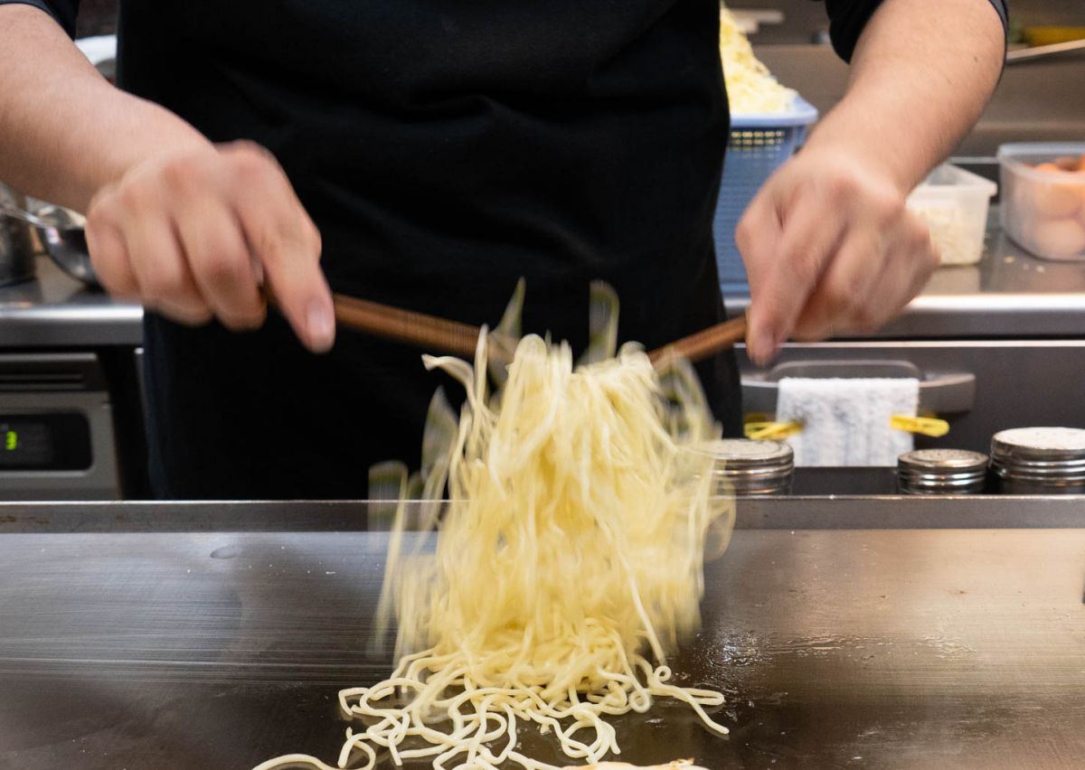 麺は太麺を使用し、箸を使って丁寧にほぐすのも越田流。こうすることで、ふわっともちっとした食感になります。