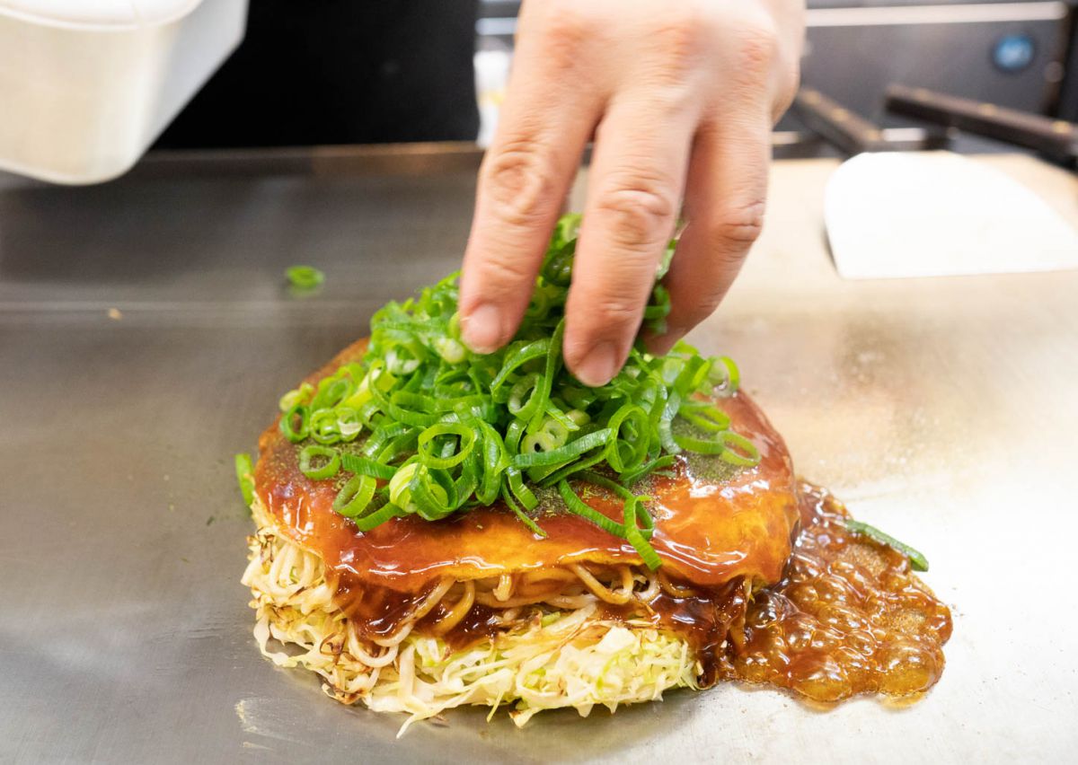 オタフクソースをかけた後、仕上げにトッピングのネギをふんだんにのせ、ふっくらとした越田スペシャルが完成!しっかりと蒸されたキャベツのしっとり食感がたまらない、優しい味のお好み焼です。