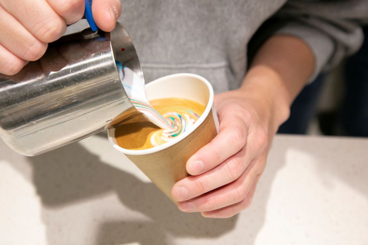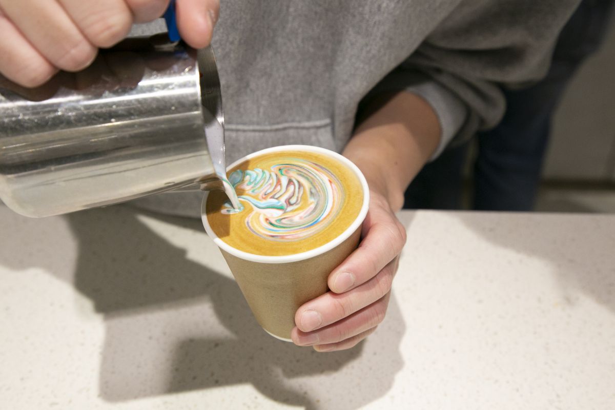 「レインボーラテ」は、メルボルンでは密かな人気メニュー。食紅の味は特になく、まずは目で楽しみます。エスプレッソの豆は下山さんがメルボルンで生み出した味を再現したオリジナルで、高級アラビカ種を使用したスペシャルティコーヒーです。