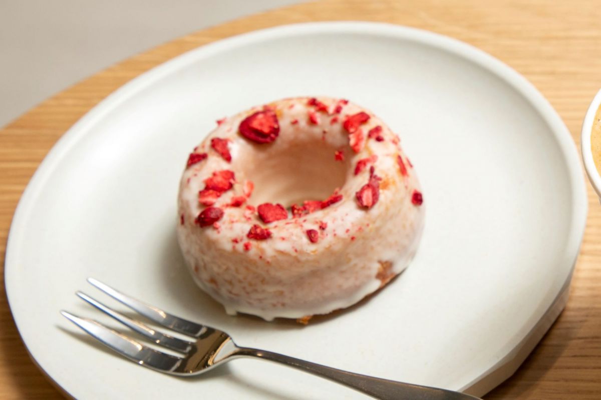 スイーツは、中崎町の本店近くにある「パティスリー ラヴィルリエ」のドーナツやケーキがスタンバイ。本格的なフランス菓子を手がけ、行列の日もあるほど人気のお店です。「ストロベリードーナツ」は甘酸っぱいドライイチゴがアクセント、ふんわりと軽い口あたりがたまりません!