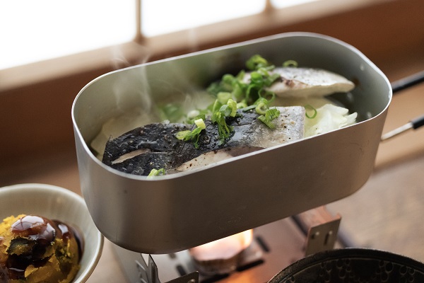 続いて、アウトドアシーンで活躍する「メスティン」を使い、アツアツの状態で食事が提供される「アルミールランチ」を。月替わりのアヒージョは、肉か魚を選ぶことができます。