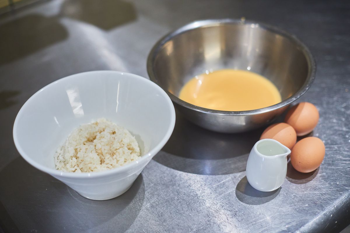 変わっているのは作り方! お願いして作っている様子を写真に撮らせていただきました。用意したのは、軽く味付けした神山鶏のピラフと溶き卵。