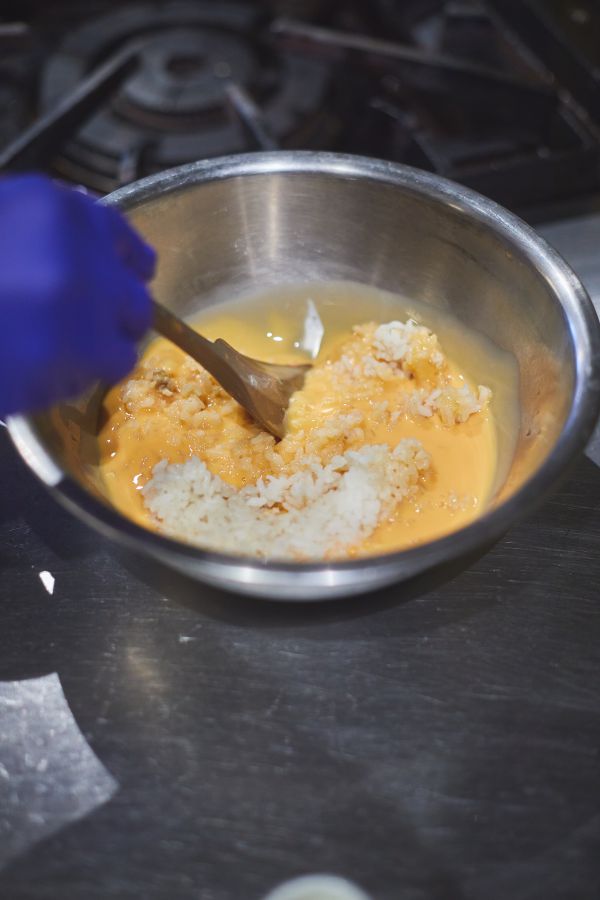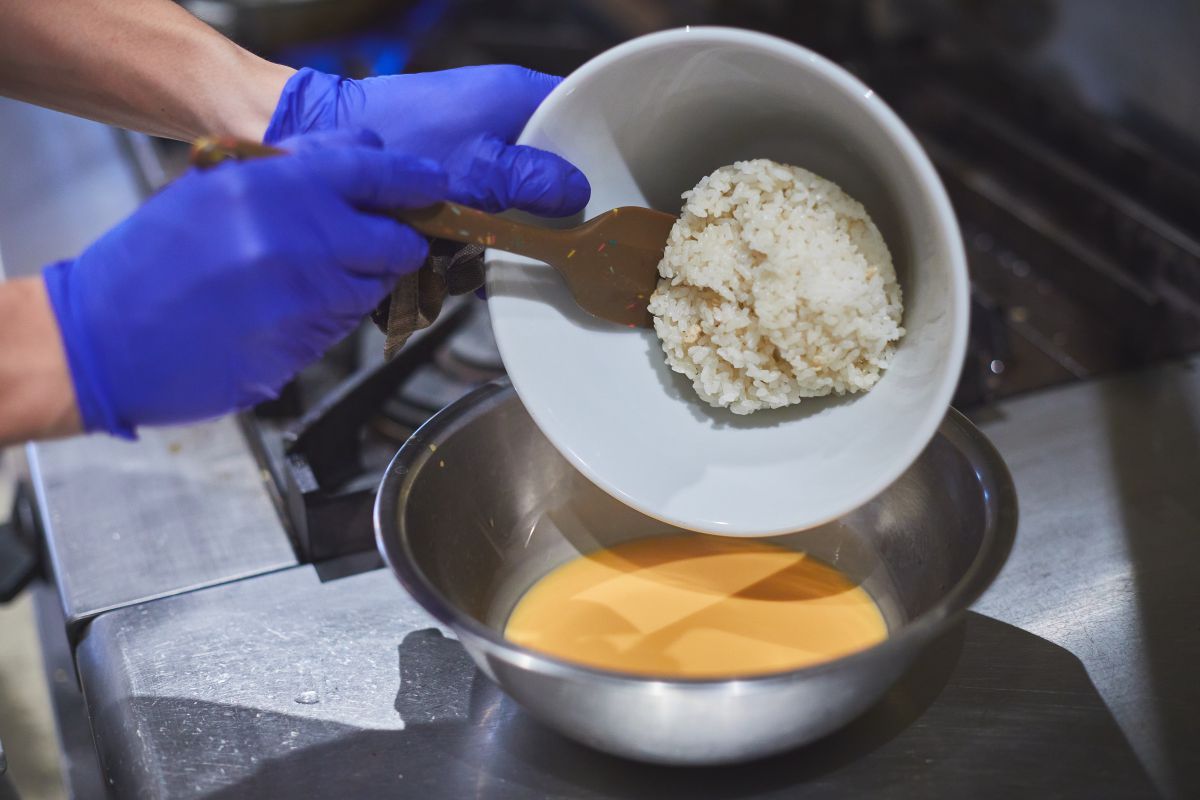 たまごかけごはんの要領でよくかき混ぜて、米に卵をしっかりと絡ませます。