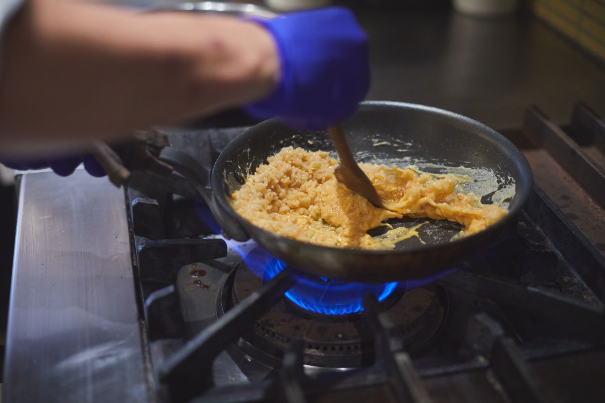 チャーハンのようにすばやく、卵が固まりきらないように成形しながら焼くのは至難の技。