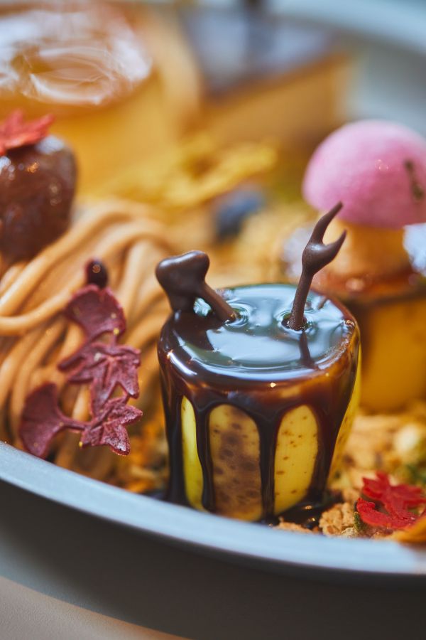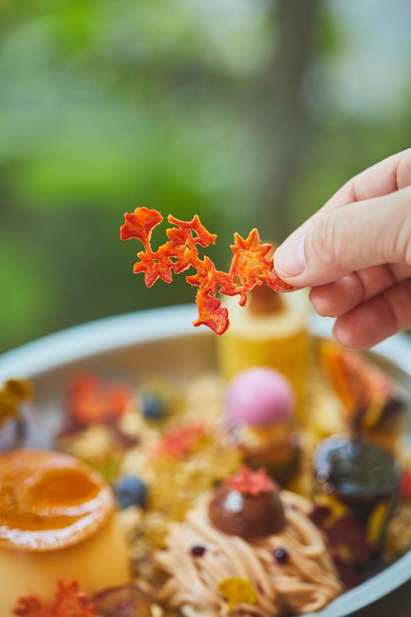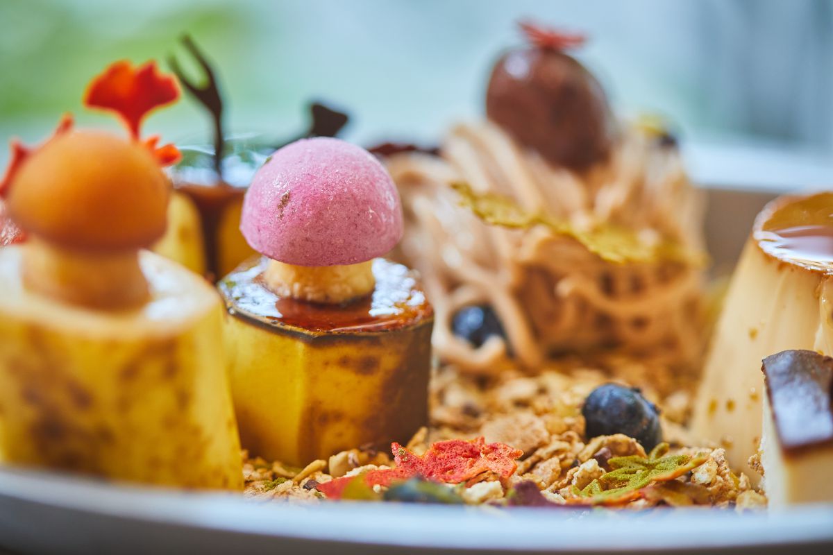 カシスのムースとクッキーで作られたきのこやチーズケーキ、モンブランなどお皿の上に小さな秋がいっぱい。絵本の中に飛び込んだようなかわいらしさです。