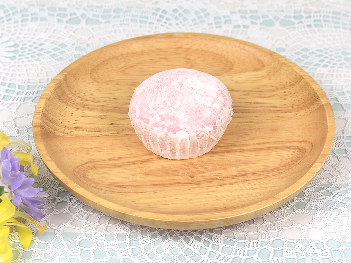薄ピンクの餅生地に包まれた、手のひらサイズの大福。見た目はいたってシンプルですが、中にはいちごのホイップクリームといちごソースがたっぷりと詰まっています。