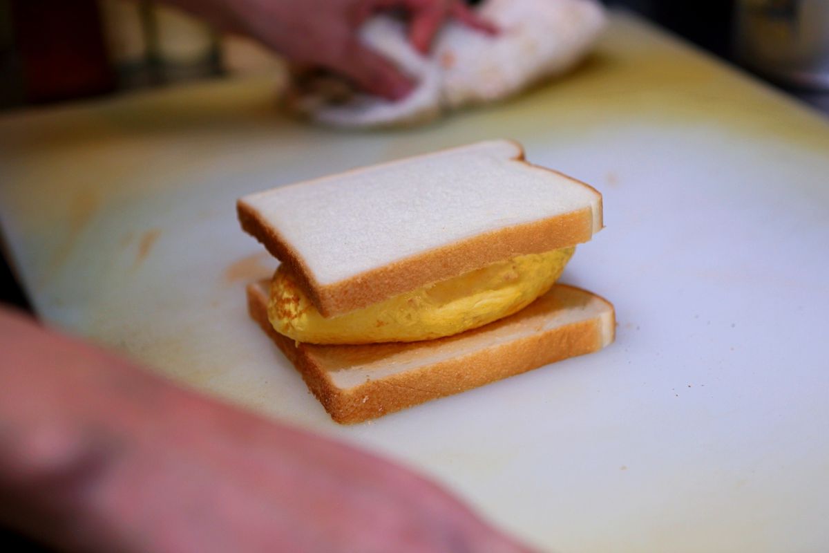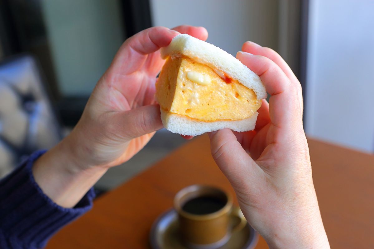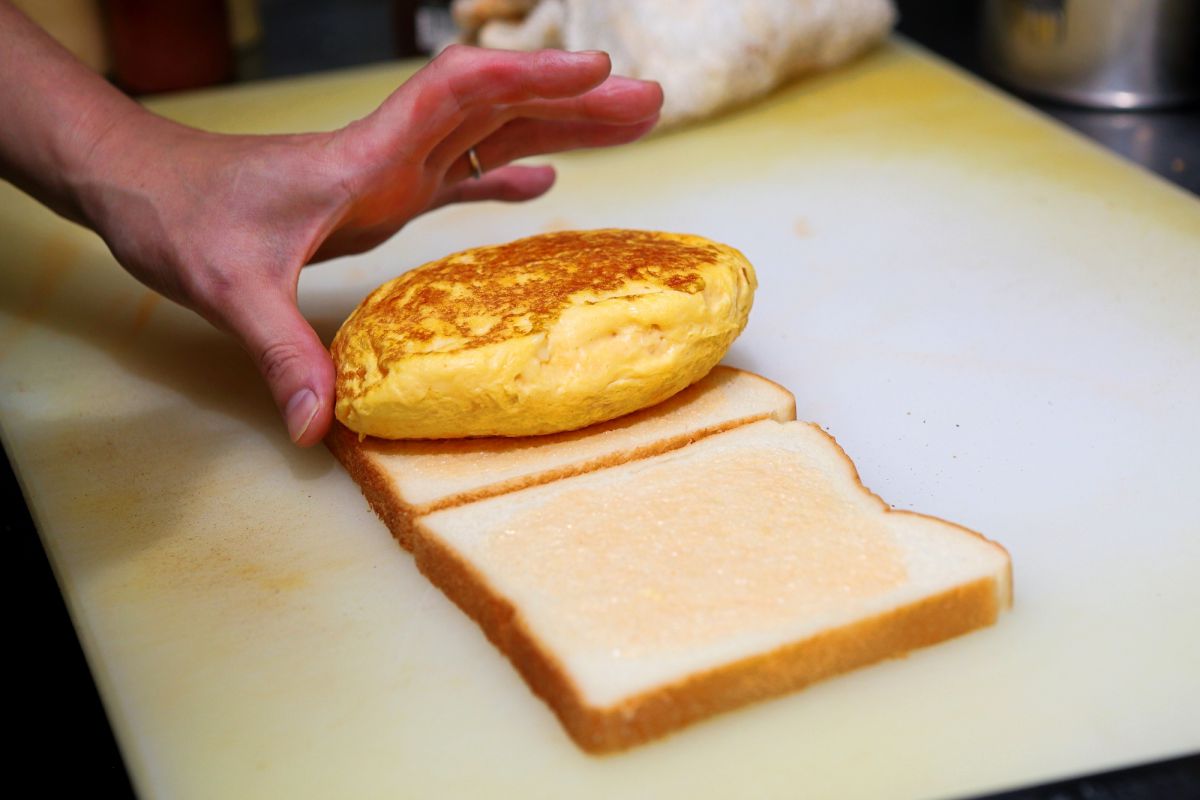 ぽってり太った卵焼きが薄くスライスされたパンに挟まれます。
