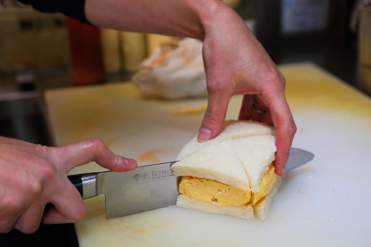 ほれぼれするこの美しさ。食べるとほんのり甘いのは、焼くときに少しシロップを加えているから。作り立ての玉子サンドは、作りたての温もりを感じられるうちに召し上がれ。