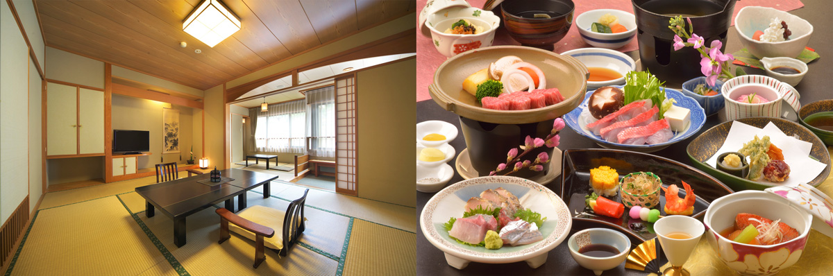 おすすめは、温泉&夕食&客室利用がセットで、最大7時間滞在できる日帰りプラン。温泉は大浴場や露天風呂、足湯があり、貸切風呂も通常40分3000円のところ1000円という割引価格に。湯上がりは浴衣に着替えて、14畳の和室でのんびり。寝具が用意され、お昼寝もできちゃいます。夕食は旬の食材を盛り込んだ会席膳をレストランで。2022年2月8日(火)からスタートする早春の期間限定メニューは、岐阜直送の飛騨牛のランプ肉ミニステーキや地魚などのお造り、金目鯛のしゃぶしゃぶといった豪華なラインナップです。