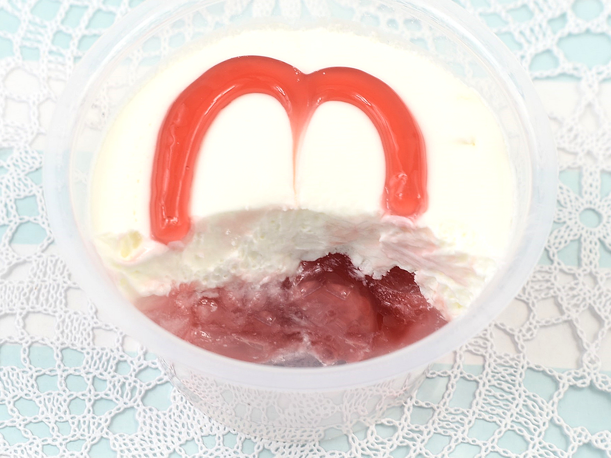 カップの半分ほどを埋めているのは、北海道産生クリームを配合した濃厚なクリーム。さっそく一口いただいてみたところ、繊細な甘みが一気に口の中へと広がっていきます。しっかりした甘みのクリームに対し、酸味を生かしたいちごソースがほどよいアクセントに。わらび餅にたどり着いていないにも関わらず、クリームといちごソースの共演に早くも満足感を覚えたほどです。