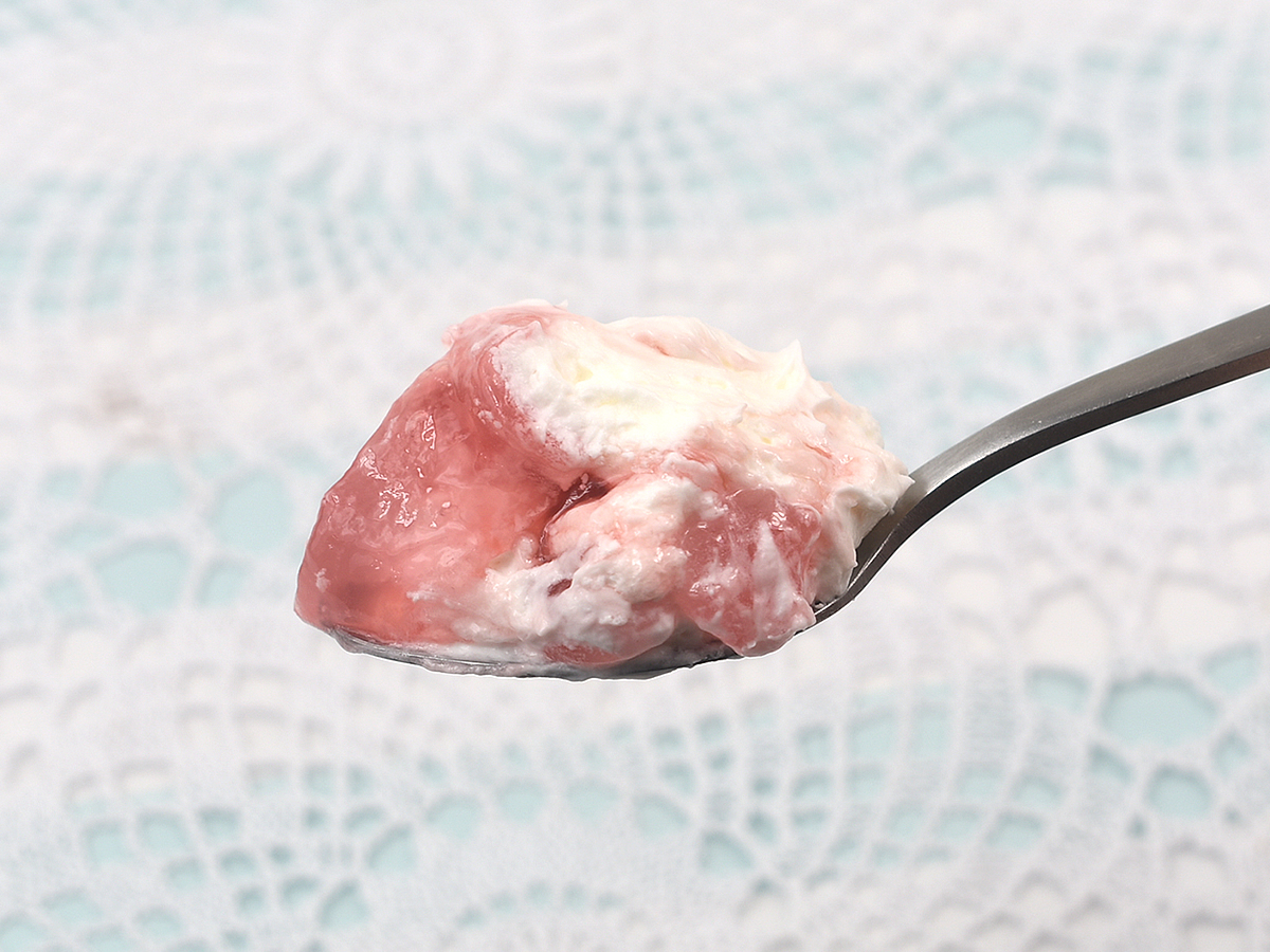 たっぷりのクリームの下から、かわいらしいピンクに染まったわらび餅が登場。国産本わらび粉を配合したわらび餅は、スプーンですくうと、とろ~りぷるんぷるん! その食感も舌の上でとろけるようなやわらかさがあり、同時にいちご果汁の優しい風味も感じさせてくれます。