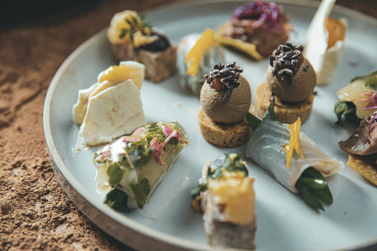 – チキンレバームース 江戸柿コンポート カカオニブ 茸サブレ