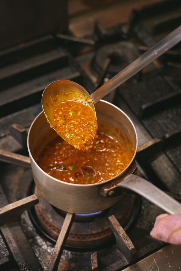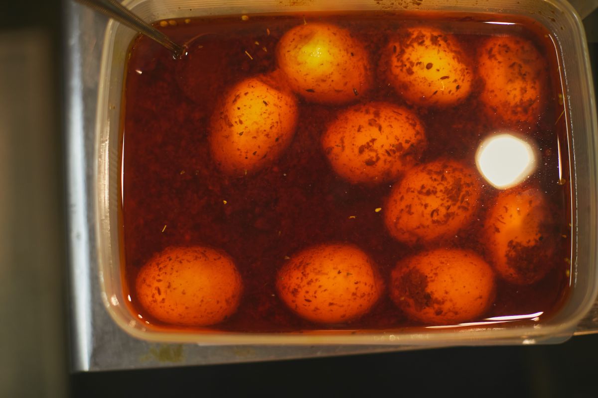 コリアンダー、クミン、ターメリック、チリパウダーなどスパイスが混沌とした液に1日漬け込み、香りをまとわりつかせたスパイス玉子。スパイスを吸い込んだ濃い黄身はとろっとろの半熟で、最高。