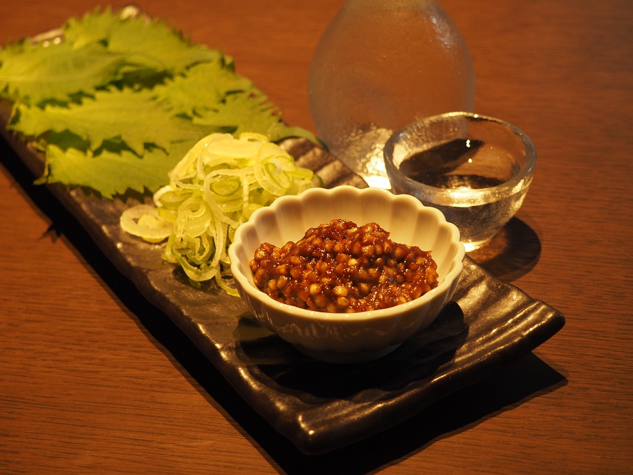 日本酒に合うとおすすめされたのが、蕎麦みそ(750円)です。そばの実の食感と甘めの味噌の相性が抜群!大葉で巻いて味わうと、より風味がアップします。