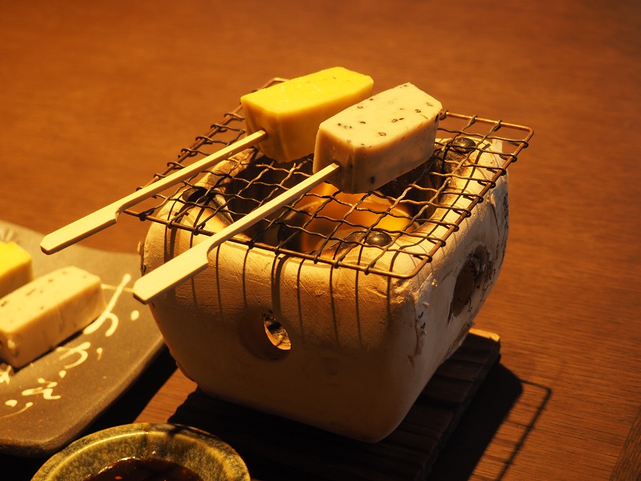 テーブルで自分好みに炙って味わえる串田楽(970円)も人気の一品。あわ麩とごま麩の2種類が盛られており、炙ることによって香ばしさがさらに付与されます。シンプルな味わいだけに、より味噌ダレのおいしさを感じられるのでおすすめです。