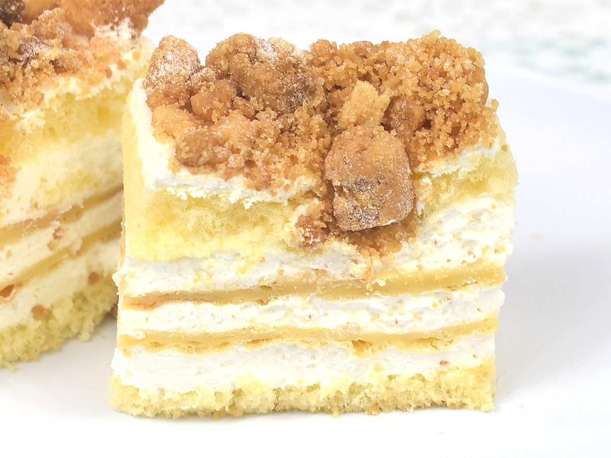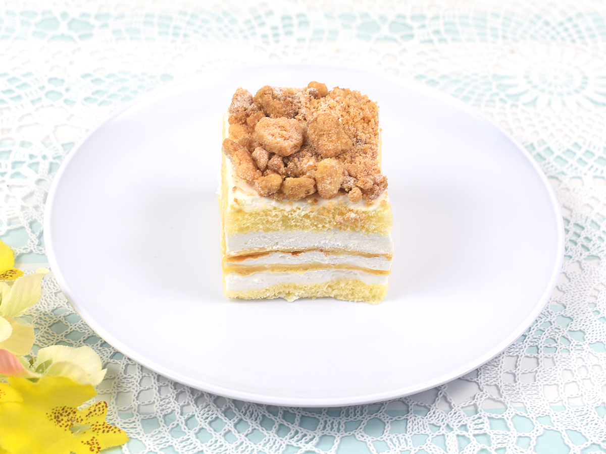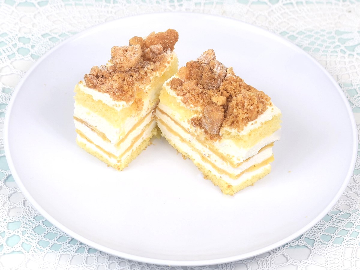 シュー生地とクリームをサンドしたスポンジ生地は、見た目以上にふんわりした仕上がり。なめらかな食感にふわふわのスポンジが重なり、さらにサクサクのクランブルがしっかりアクセントになっています。
