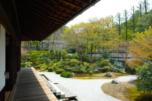 本坊にある御座所からは、歴代天皇も鑑賞されたという美しい庭園を見ることができます。林泉形式の庭で、山や池の周囲に木々がバランスよく配されています。庭に植えられたもみじが一斉に色づく秋も見もの。伽藍拝観500円で境内に入り、さらに特別拝観300円で本坊に入ることで見学できます。