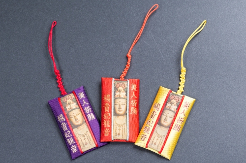 参拝のあとは、ユニークなお守りでご利益を持ち帰りましょう。こちらは、楊貴妃観音お守り500円。楊貴妃観音が描かれていて、色は赤、紫、黄から選べます。身に付けた人をきっと美しく導いてくれるはず!
