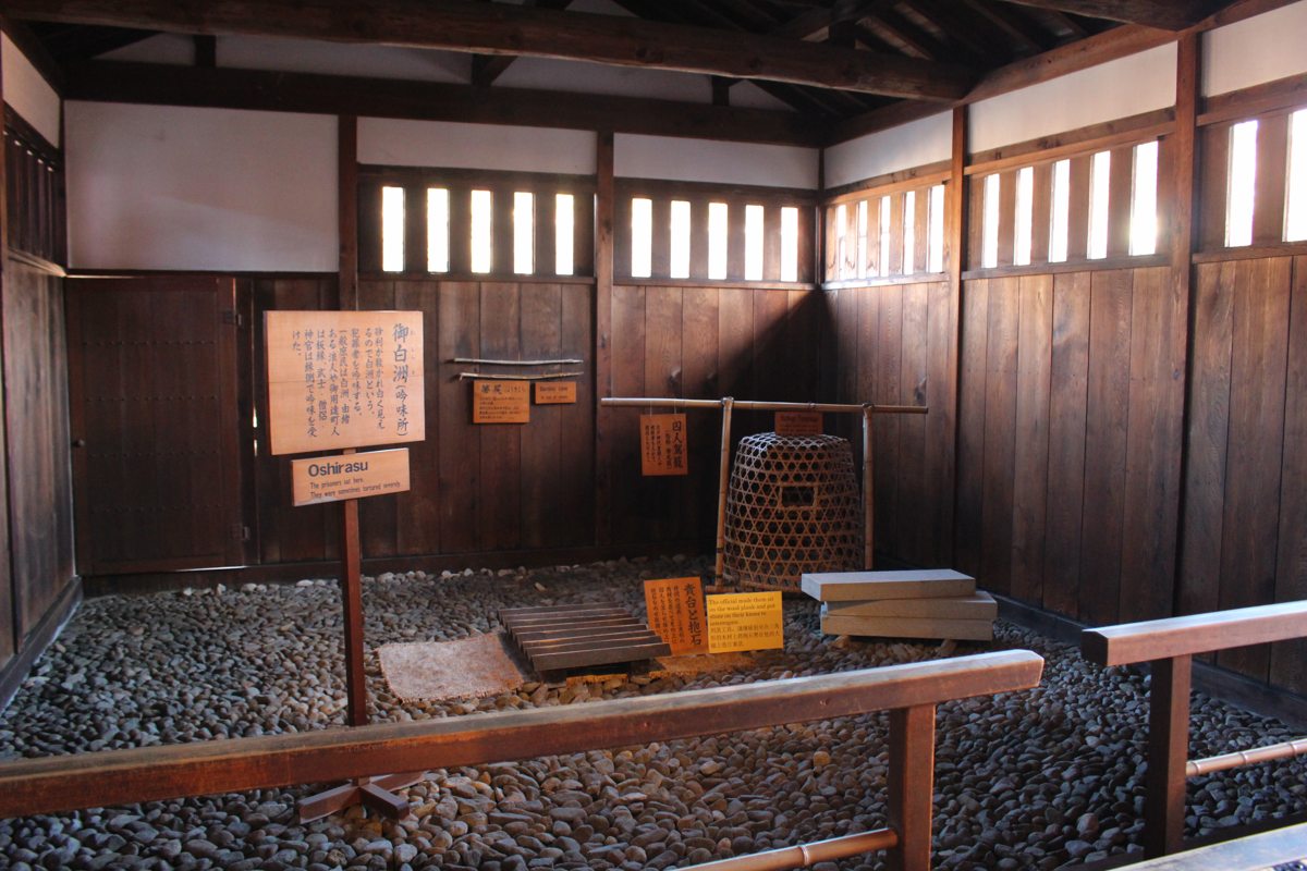 役人たちの仕事場エリア、郡代の生活エリア、貯蔵庫や歴史展示など、みどころがたくさん!こちらは郡代役所の御白洲(おしらす)。事件の取り調べや裁判を行った場所で、拷問の道具がリアルすぎてちょっと驚きます。