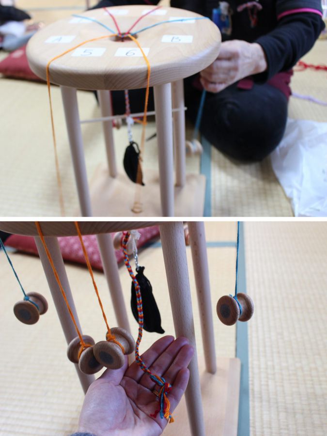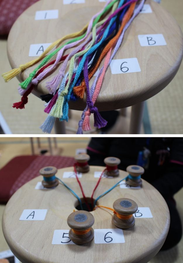 好きな色の紐を6本選ぶのですが、迷ってしまい…スタッフの方が教えてくれた人気アニメ映画とお揃いのカラーにしちゃいました。丸台に1~6番の数字とA・Bの印が付けられていて、順々に紐のついた重りを移動させることで、少しずつ紐を組んでいく、という感じです。