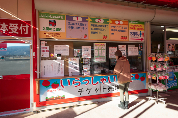 伊豆のおいしいいちごをおみやげにしたい場合は、いちご狩りを終えた後にセンターの専用駐車場へ。窓口の隣には、いちごづくしのおみやげ品が並んでいます。