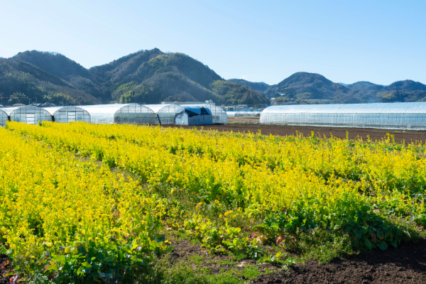 車窓から見えるのは、ずらりと並ぶ約90ものビニールハウスと、春の醍醐味である可憐な黄色の菜の花畑。3月中旬ごろまでが花の時期で、いちご狩りセンターを利用した場合のみ、菜の花を摘み取って持ち帰ることができます。