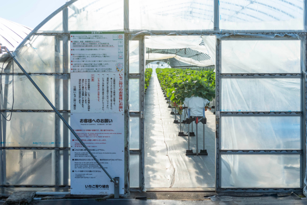 さて、本日の舞台となるビニールハウスに到着しました。ハウス内はいちごの生育環境に合わせて温度設定がされており、冬でもぽかぽか。車はハウスのすぐ近くに停められるので、厚着をせずに中に入りましょう。