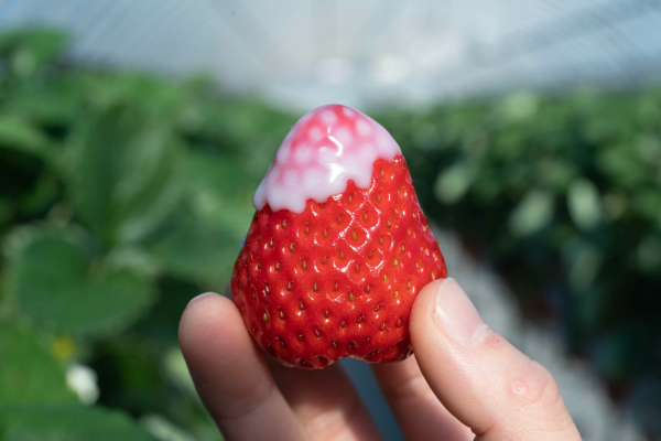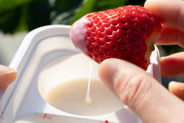 いちご狩りが後半に差し掛かったら、ぜひ練乳も試してください。ミルクをまとったいちごは、まるで雪をかぶった富士山のよう。静岡らしさがここにも!
