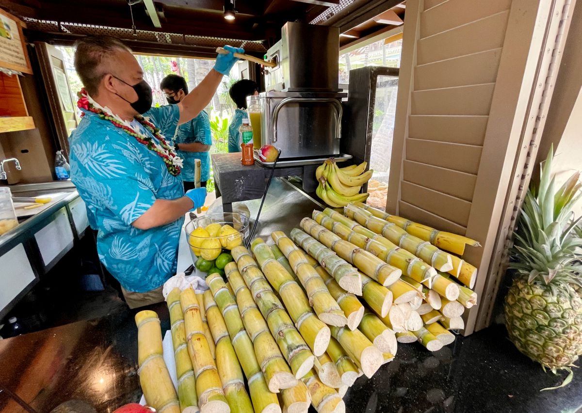 ロイヤルハワイアンセンター中央のキオスクに登場した「ハワイアン・ケーン・ジュース」は2021年12月にオープンしたばかり!新鮮なサトウキビから絞ったフレッシュジュースやスムージーが楽しめるジューススタンドです。