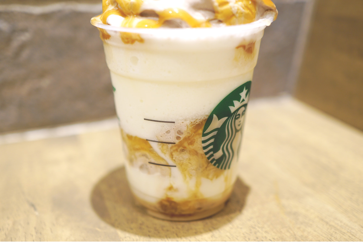 「ベイクド&クリーミー 生ホワイトチョコレート フラぺチーノ®」はまろやかで飲み飽きない味わいですが、すこしアクセントをつけるなら、香ばしさをUPするキャラメルソースを追加(無料)するのがおすすめです。ホワイトチョコレートソースの味も引き立ちますよ。